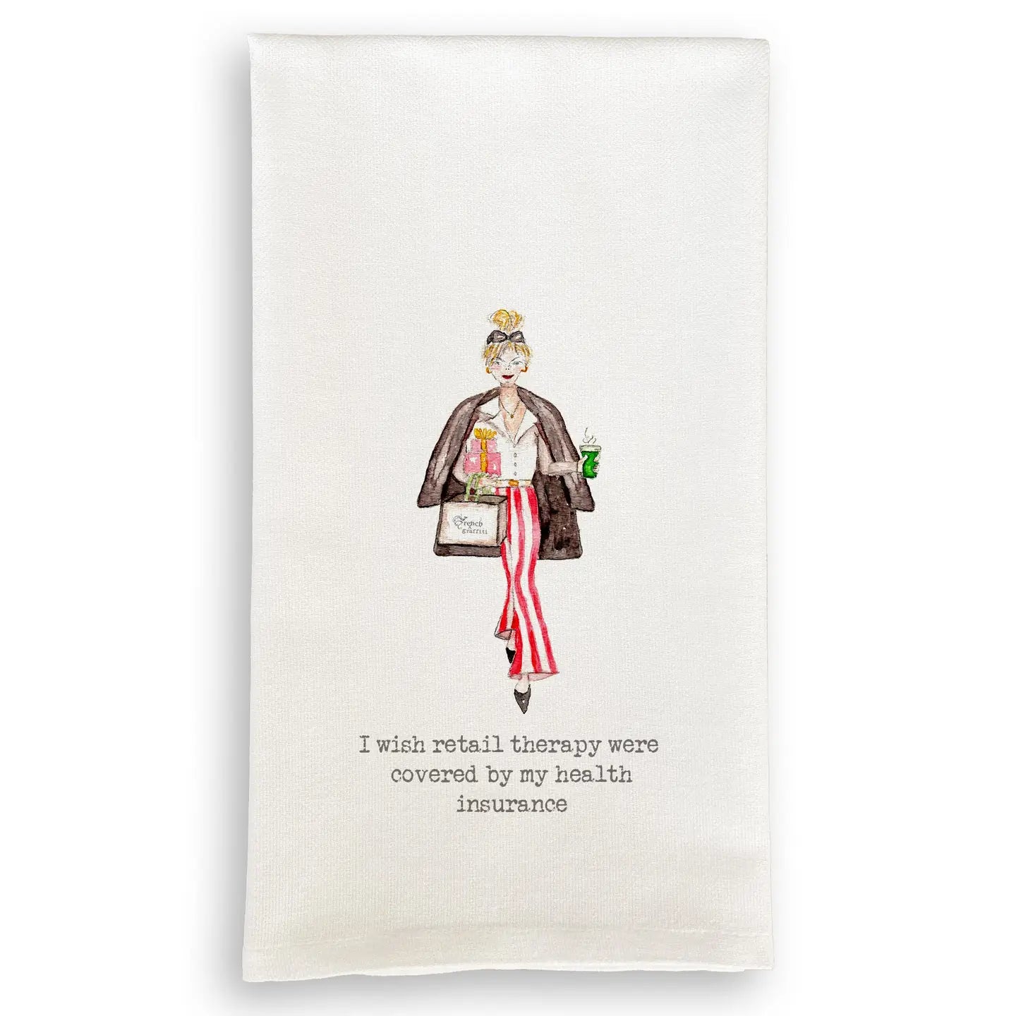 Details: The "Retail Therapy" decorative towel is 100% cotton.