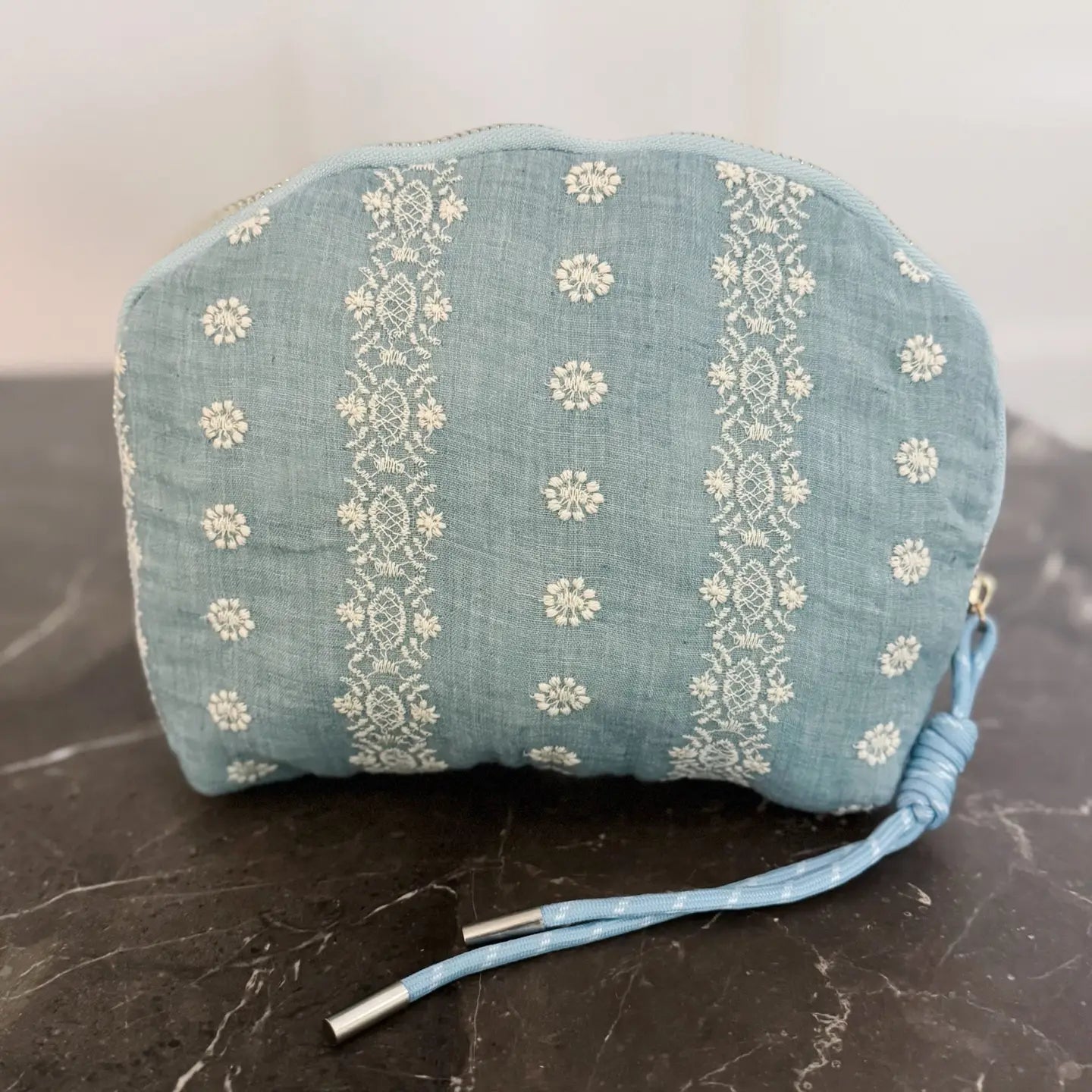 Here's why this is perfect for Whatever Your Day Brings®: This charming cosmetic case features a blue and white crochet-inspired pattern on soft, structured fabric. With its vintage look and practical size, it’s perfect for holding your daily beauty essentials or travel must-haves. Lightweight, stylish, and easy to carry in any bag.