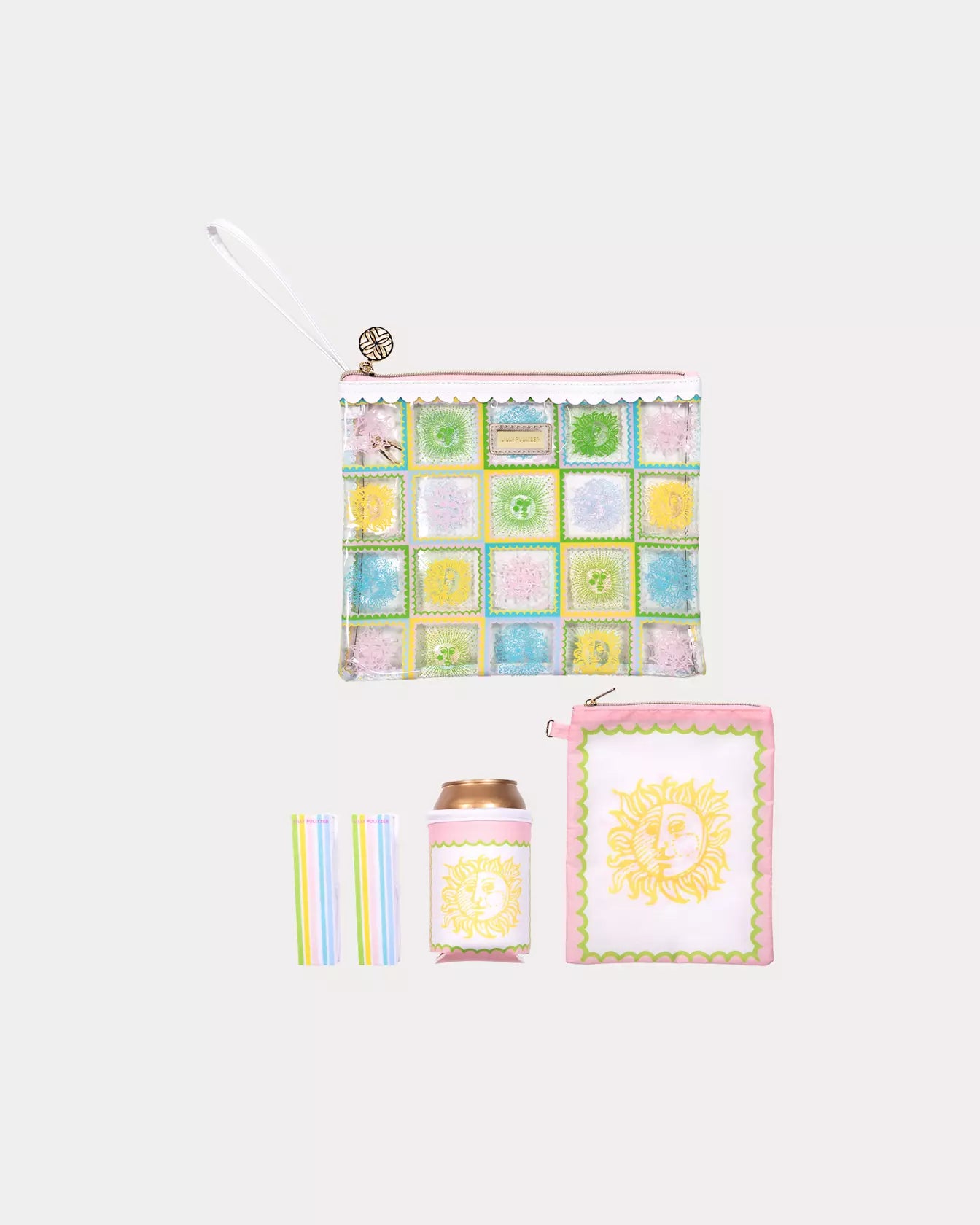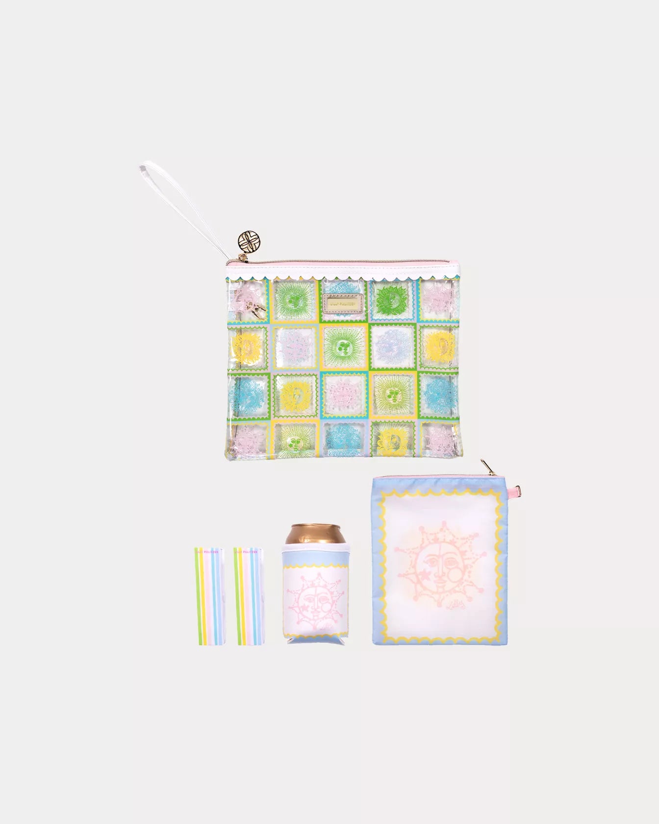 Details: The "Beach Day Pouch" features a printed vinyl pouch includes an interior zip pouch, drink hugger, and 2 beach towel clips. The Exterior pouch measures 10 1/2"W x 9"H-Interior pouch measures 6"W x 7 3/4"H. Please note: due to the vibrancy of Lilly Pulitzer colors, this product’s color may vary slightly when seen in person.