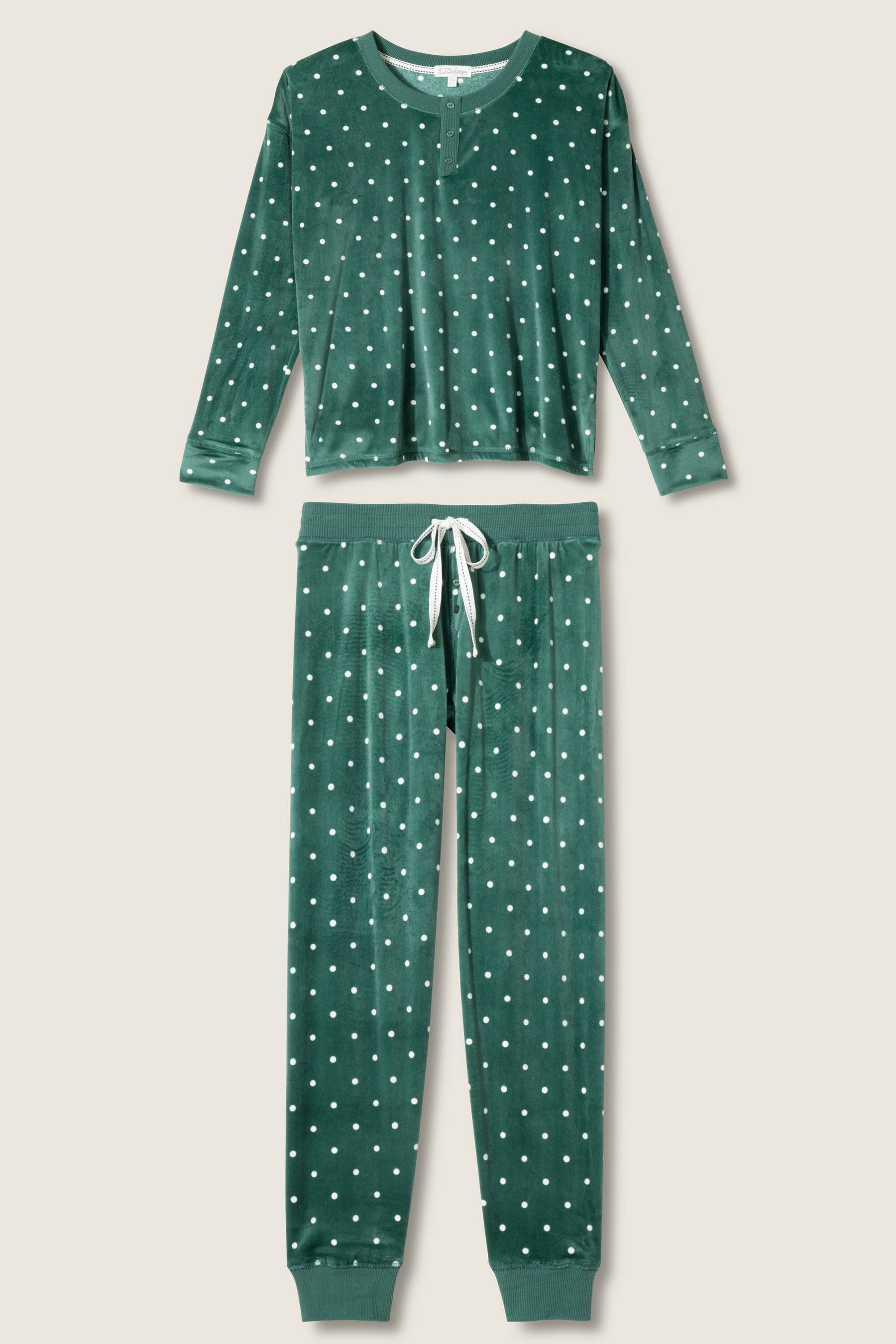 Here's why this is perfect for Whatever Your Day Brings®: Silky-soft forest-green velour makes this set as plush as it is festive. The long sleeve henley top features a button placket and banded cuffs, paired with jogger-style pants finished with a drawstring waist and cuffed hems. Scattered in playful white dots, it’s made for holiday lounging that feels a little luxe.