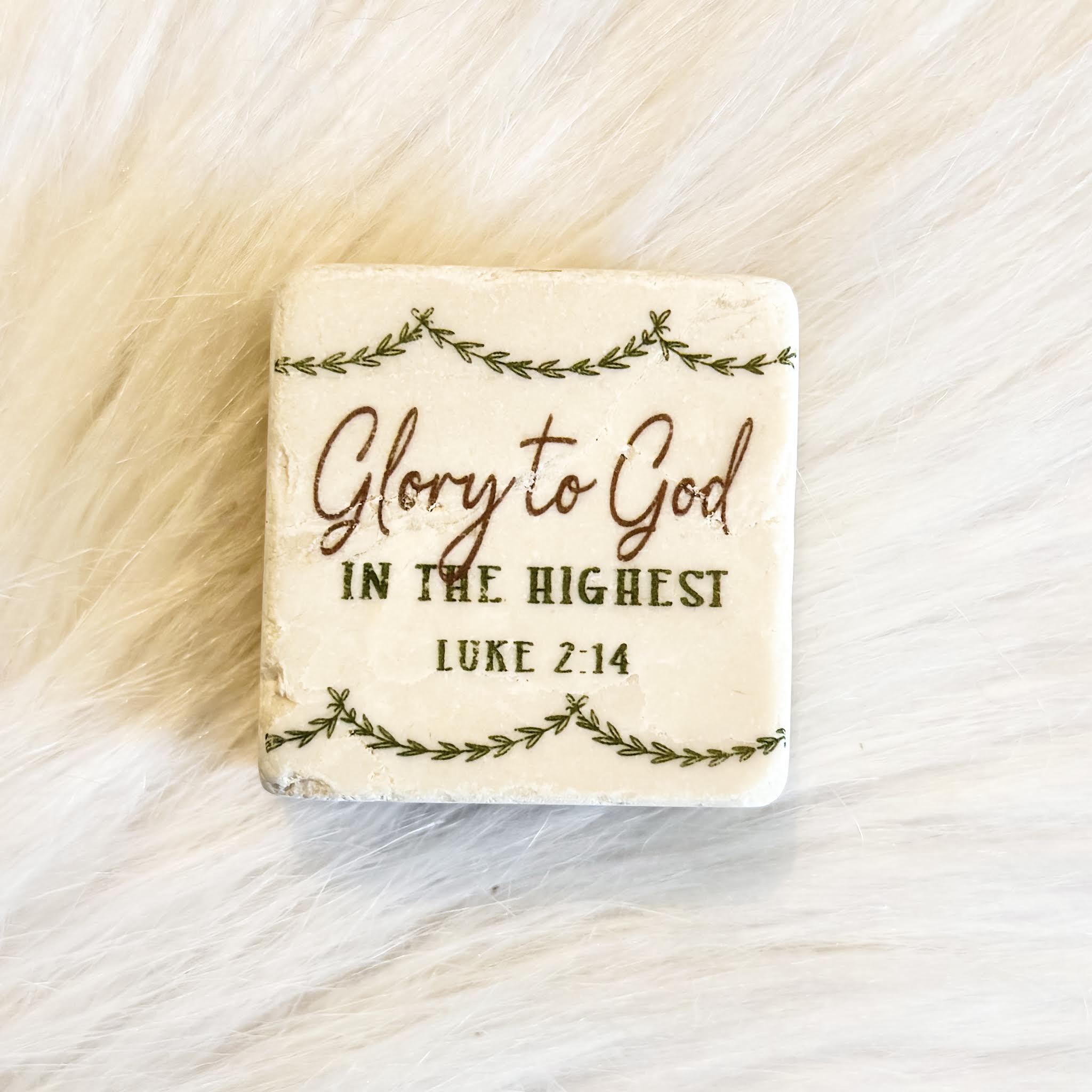 Details: The “Scripture Stone” is hand-printed and distressed by artisans here in the United States and measures 2" x 2" x 1".