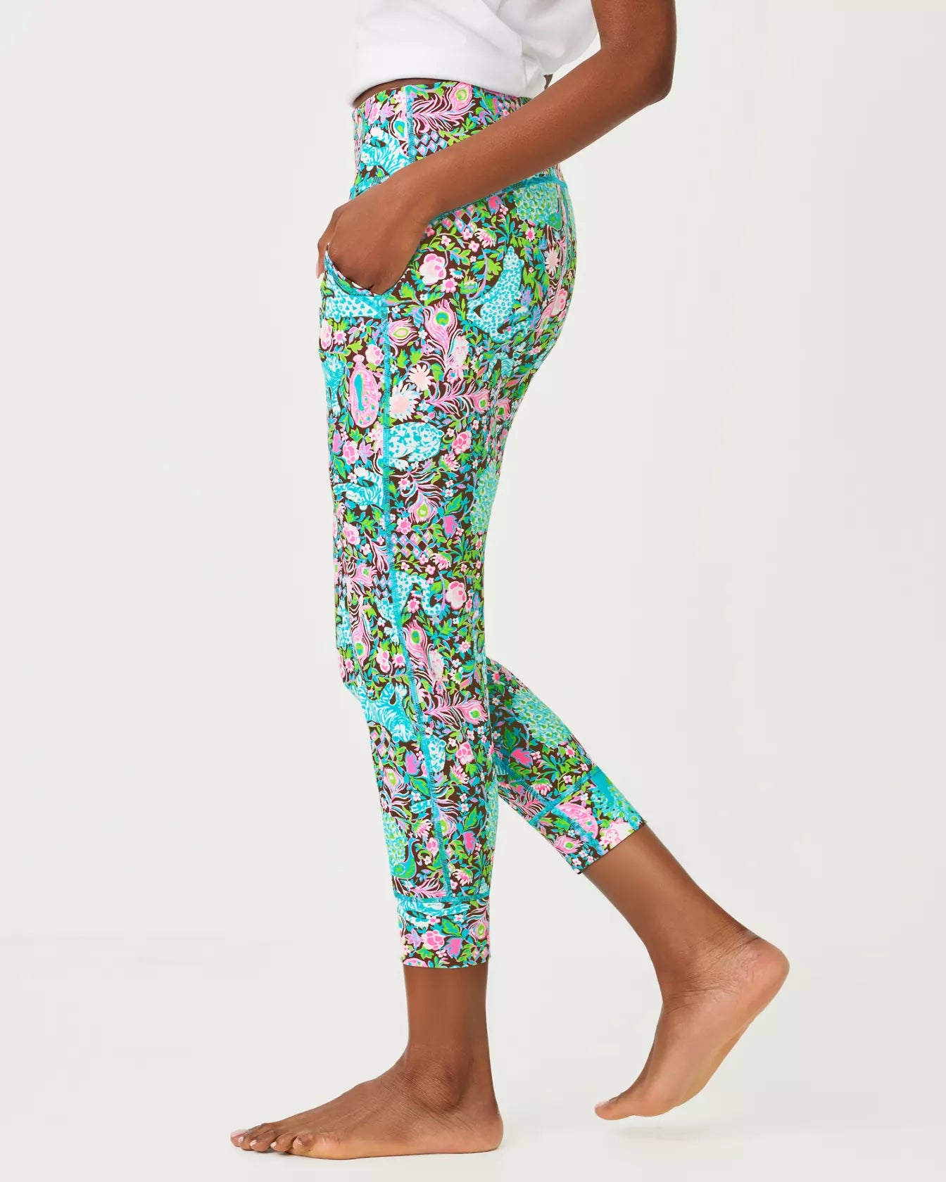 Details: The "Royal Zoo" UPF 50+ Luxletic 24" weekender high rise leggings are Zen Nylon Interlock (82% Nylon, 18% Spandex). Machine wash cold, delicate cycle, separately. UPF 50+ Luxletic® high rise legging with two side pockets. Waist is intended to sit at natural waist. Inseam is intended to sit at lower calf.