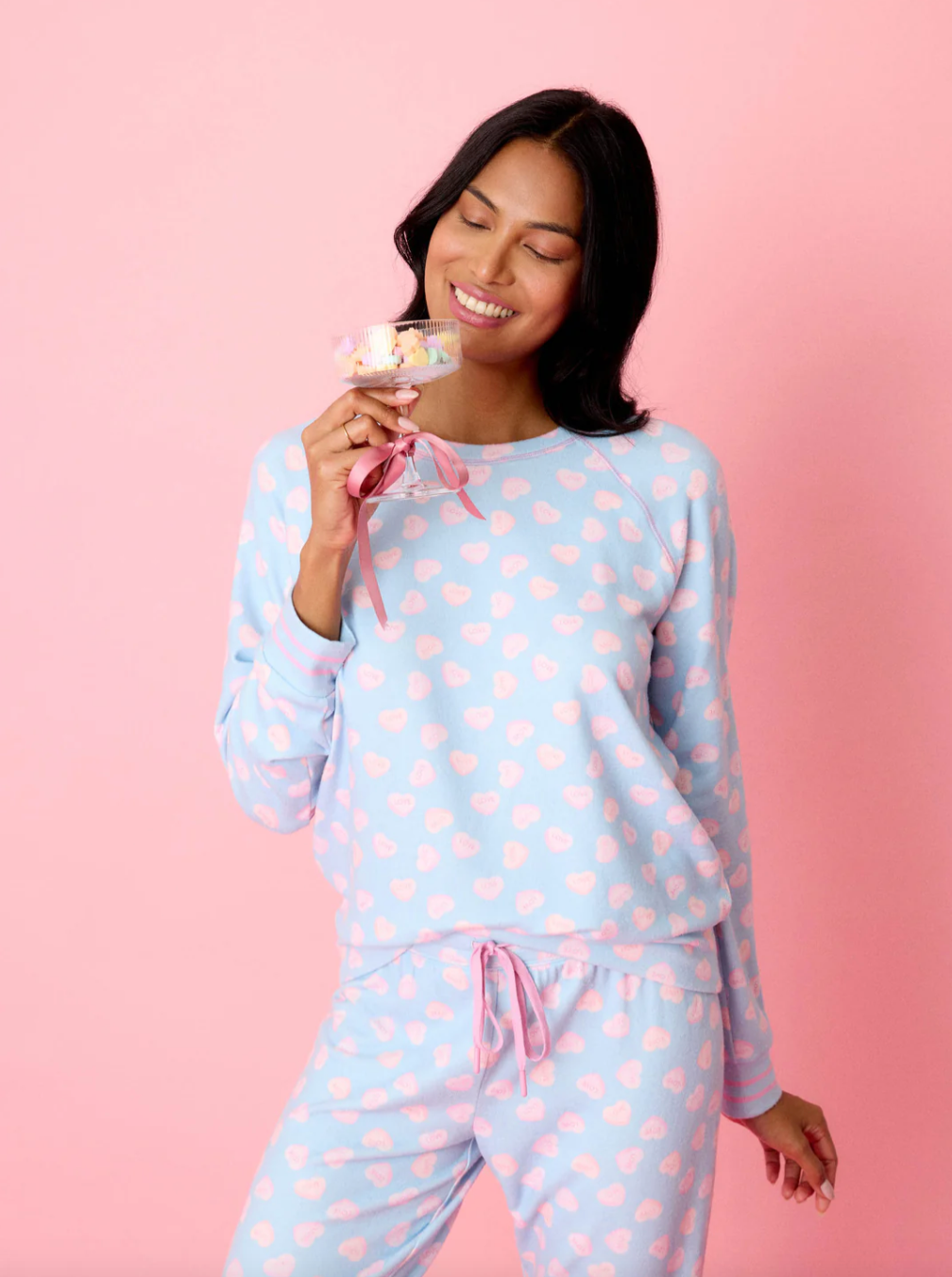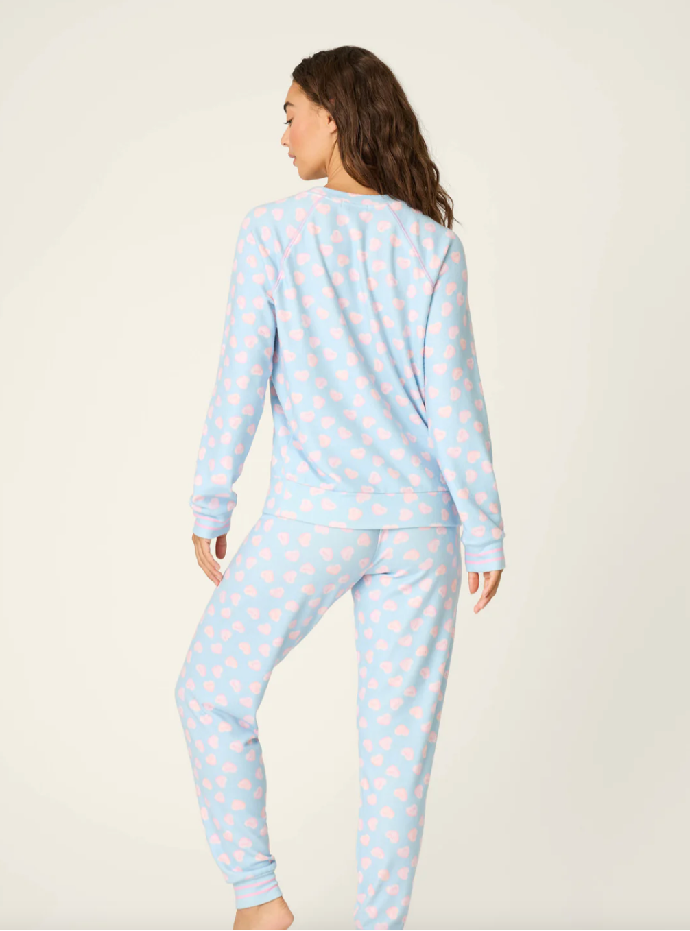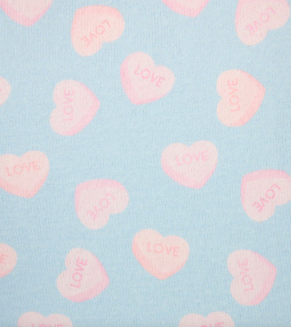 Sweet like candy hearts, this blue haze pajama set brings nostalgic charm to cozy nights in. Crafted from our signature peachy jersey, the long-sleeve crewneck top and cuffed pants are sprinkled with pastel hearts that read “Love,” adding a playful dose of sweetness to your winter sleep rotation.