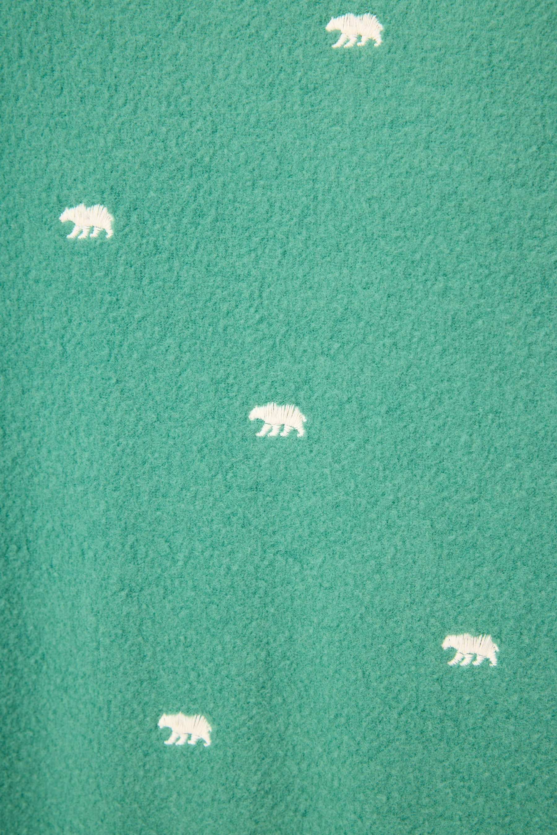 Details: The “Outsider” embroidered bear PJ set is 50% Polyester 38% Cotton 12% Rayon - Lofty Vintage Fleece.