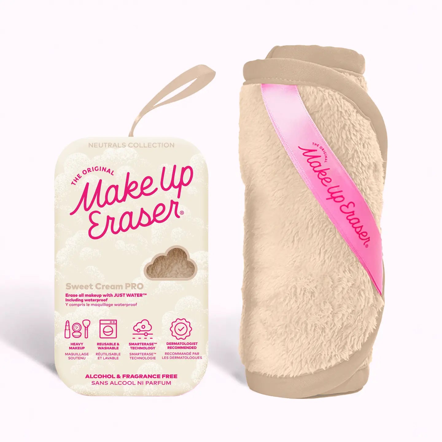 Details: The "Sweet Cream" MakeUp Eraser Pro measures 15.5in x 7.25in. Erase all makeup with JUST WATER™ including waterproof. Our patented, water-activated, cloud-soft fibers gently & easily remove all makeup & sunscreen from pores. 2 in 1 benefit: one side erases makeup & one side exfoliates skin.