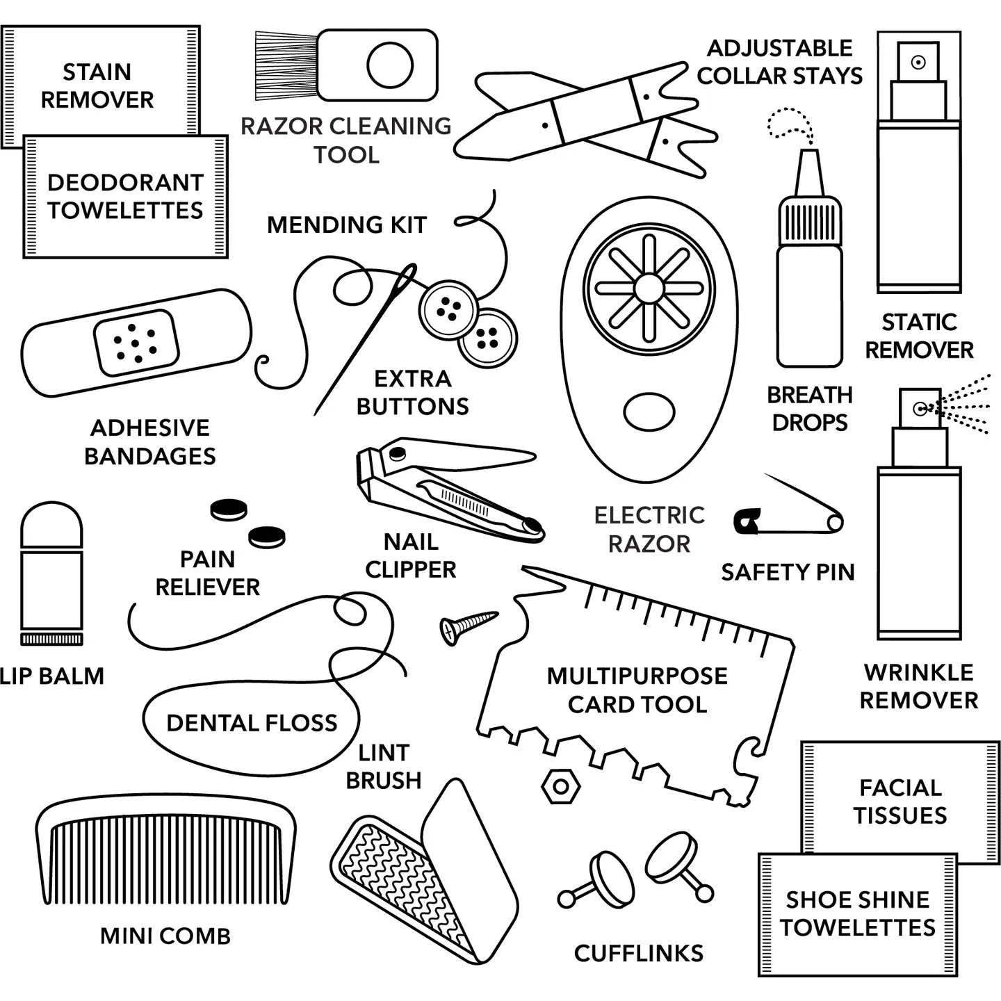 Details: The "Hemergency" kit contains: Stain remover towelettes, deodorant towelettes, electric razor with cleaning tool, collar stays, adhesive bandages, mending kit, safety pin, breath freshener, static remover, lip balm, pain reliever extra buttons, safety pin, nail clipper, dental floss, wrinkle remover, multipurpose card tool, mini comb, lint brush, cufflinks, facial tissues, shoe shine towelettes.