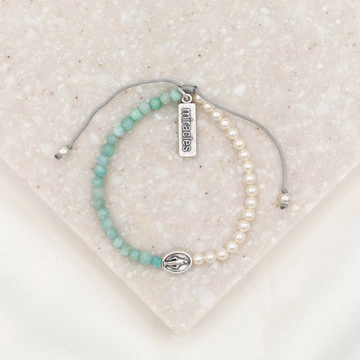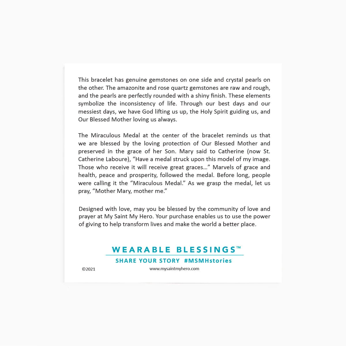 Details: The “Mother Mary, Mother Me” Bracelet is a handwoven and opens to 9.5" and closes to 6.25", with a sliding slipknot. Amazonite or rose quartz gemstones, natural gemstone beads vary in size and coloring. Heirloom-quality crystal pearls. These premium heirloom-quality crystals are lead-free, sustainably manufactured, and environmentally friendly. Gold or silver-tone Mary Medal and "miracles" charm tag. Handwoven in Mexicali. Medals hand-cast in a sacred site in Italy. Mother Mary, Mother Me Gemstone and Miraculous Blessing Bracelet comes in a box with an inspirational card.