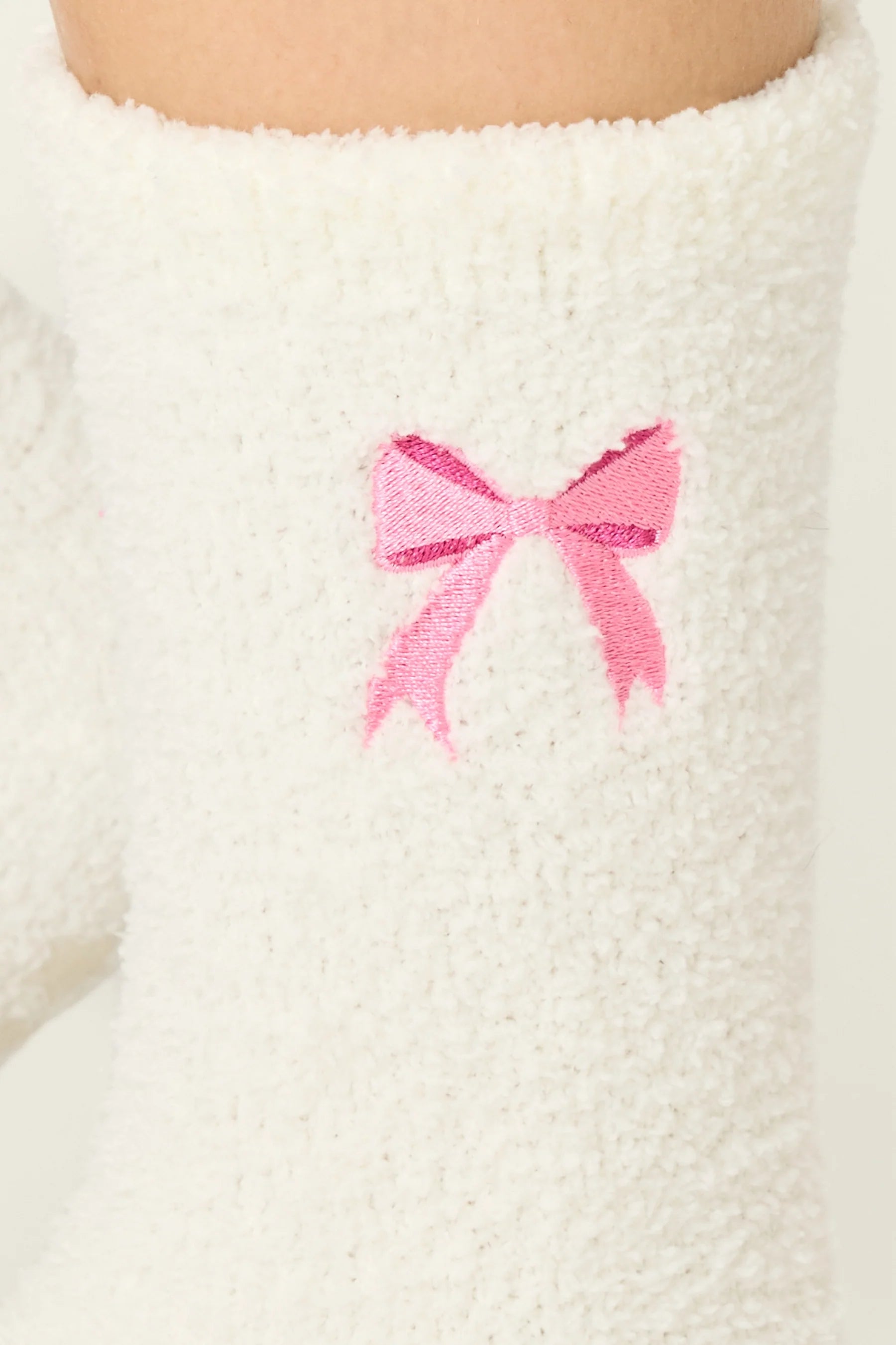 Here's why this is perfect for Whatever Your Day Brings®: Tie your look together with these ivory fuzzy socks, embroidered with dainty pink bows. Finished with non-slip gripper bottoms, they’re a festive little treat for holiday lounging.