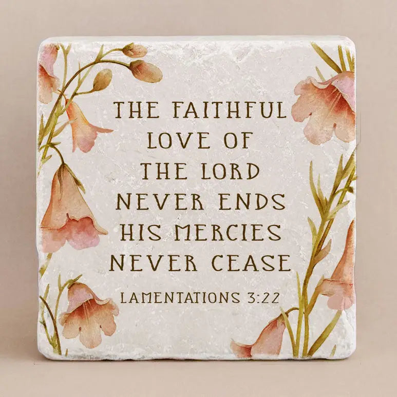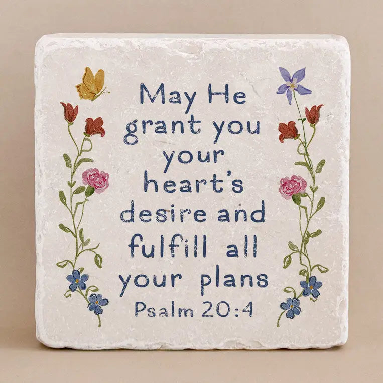 Details: This Scripture Stone is hand-printed and distressed by artisans here in the United States and measures 4" x 4" x 1".
