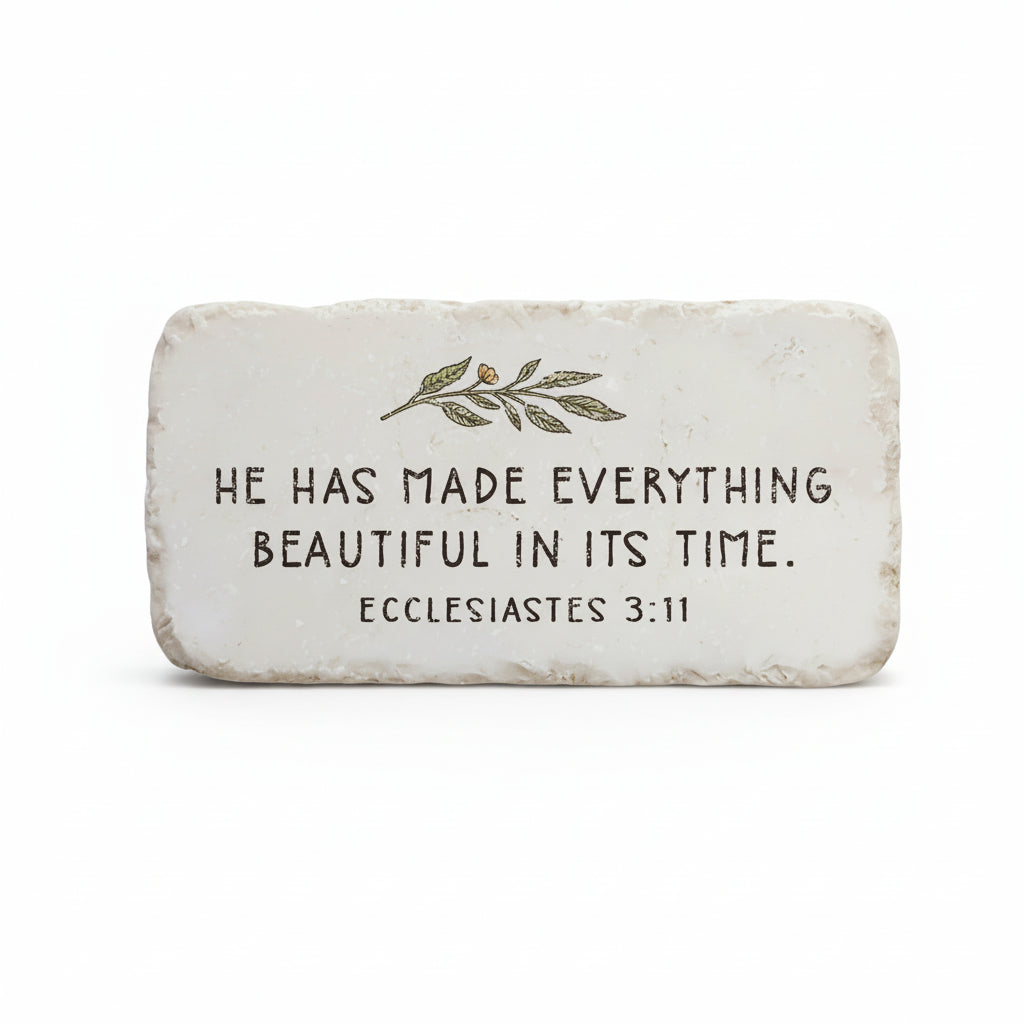 This Scripture Stone is hand-printed and distressed by artisans here in the United States. This unique marble is quarried in the mountains east of the ancient city of Ephesus