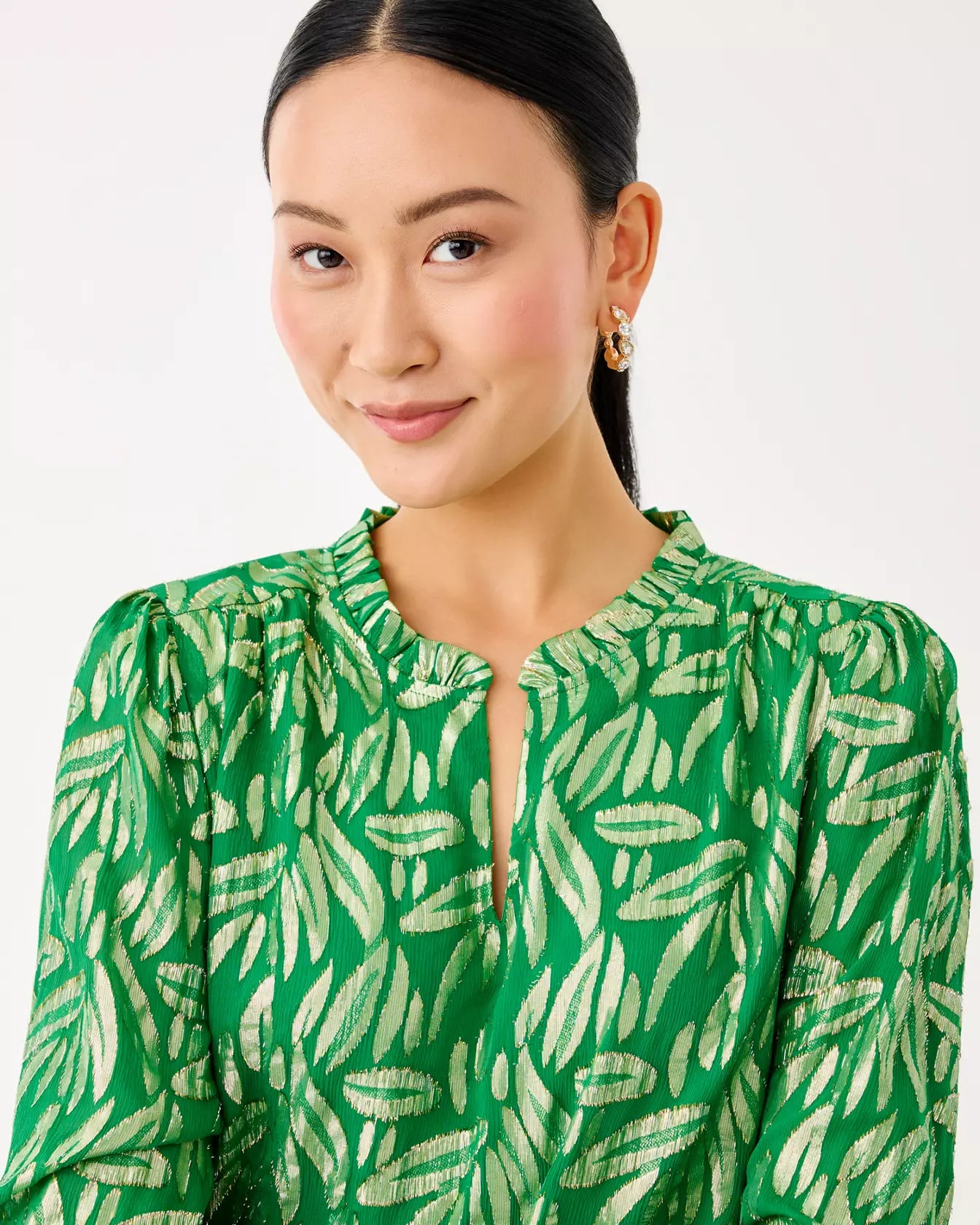 Details: The "Bamboo Green" Giana long sleeve silk top is Floral Bloom Silk Clip (77% Silk, 23% Metallic). Dry clean only. Easy fit, notch neck blouse with a ruffled neckline and long full sleeves with elastic cuffs. Skims the body. Roomier fit.