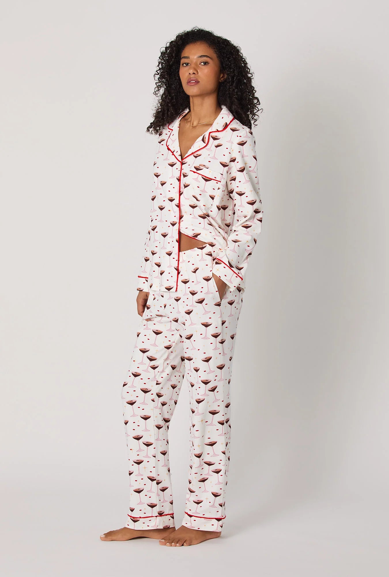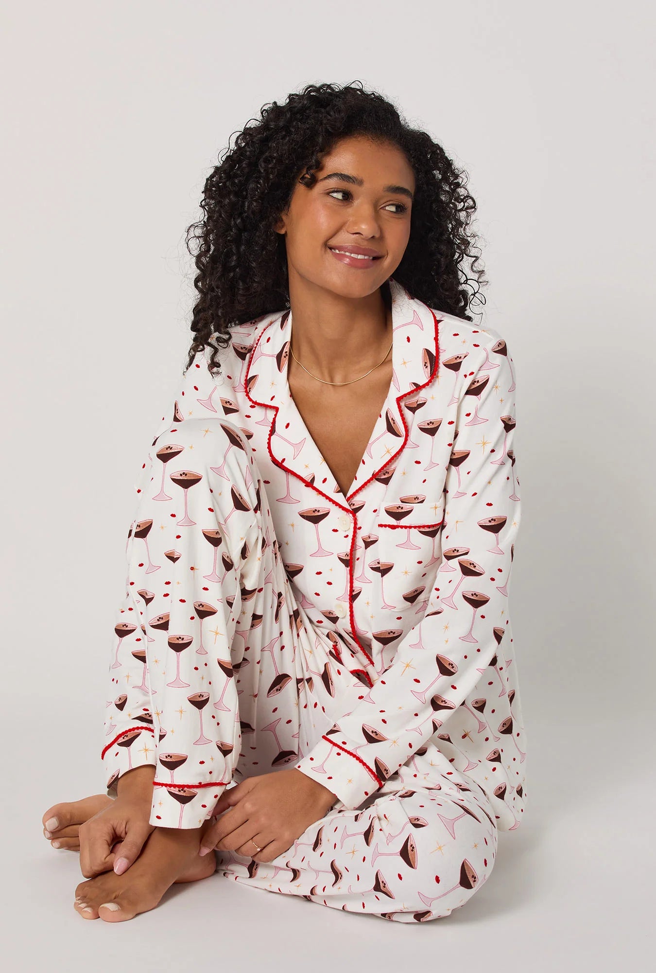Here's why this is perfect for Whatever Your Day Brings®: What’s better than an espresso martini? A whole pajama set inspired by one. Featuring a playful martini print and red pom-pom piping, this long sleeve set brings the fun while keeping you wrapped in dreamy and soft cotton jersey. Cheers to cozy nights in.