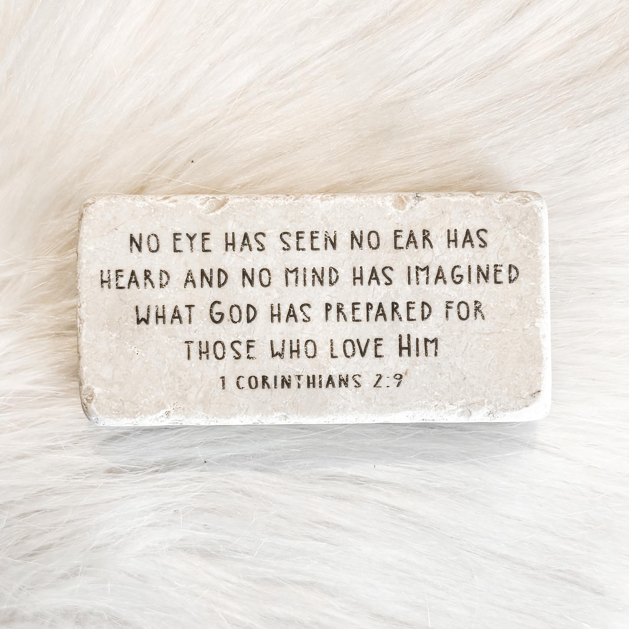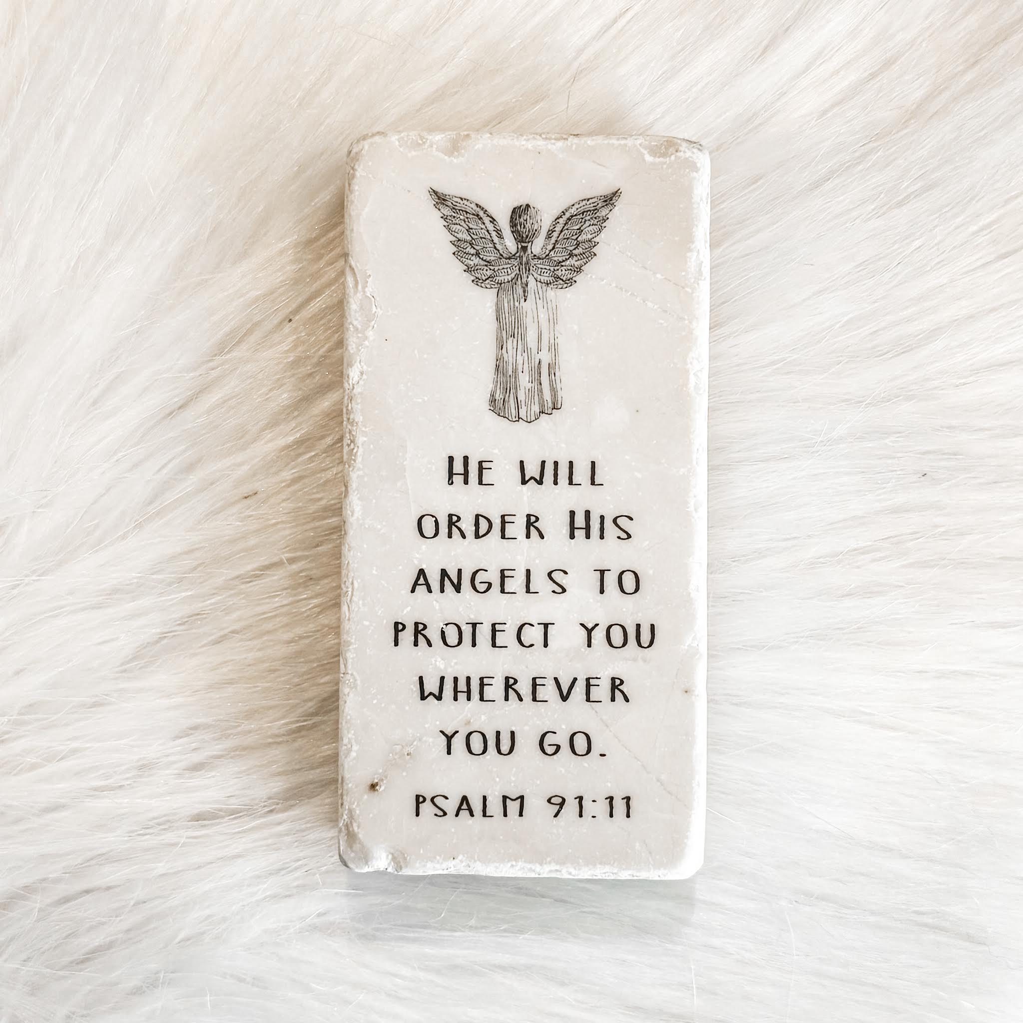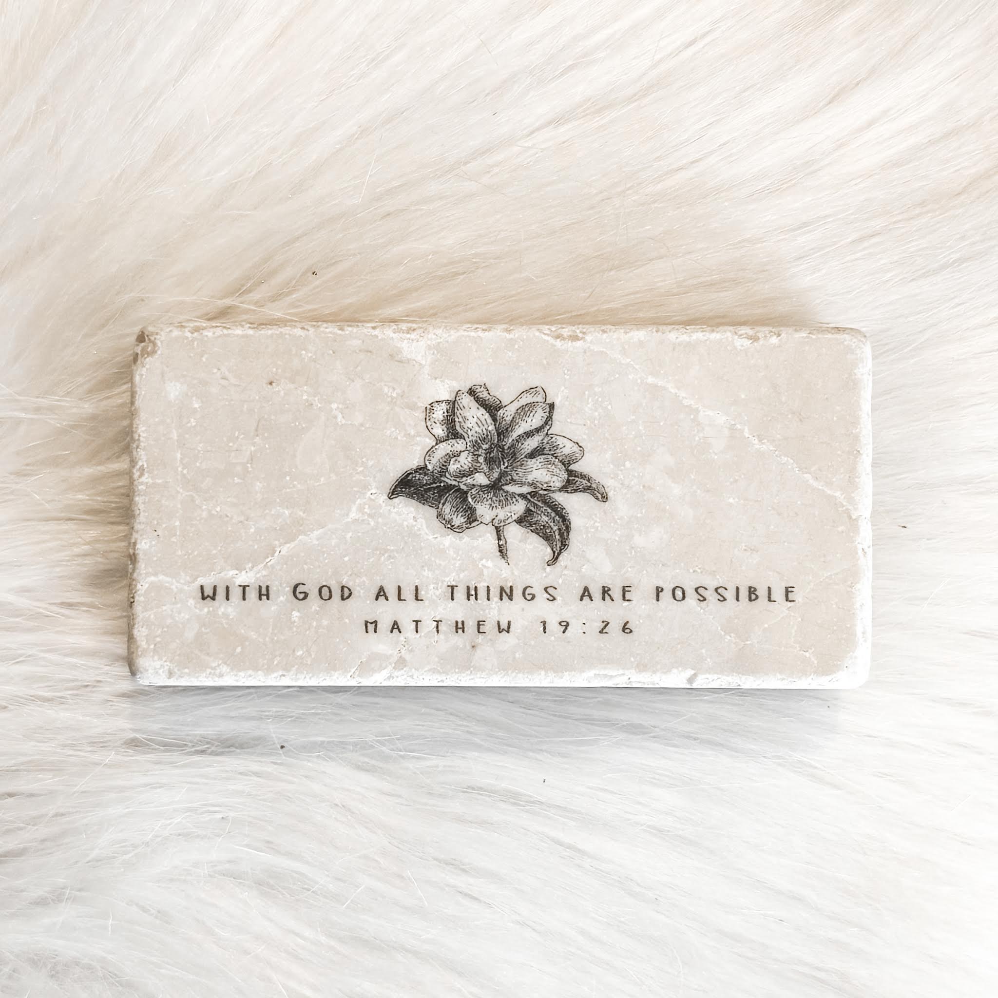 This Scripture Stone is hand-printed and distressed by artisans here in the United States. This unique marble is quarried in the mountains east of the ancient city of Ephesus