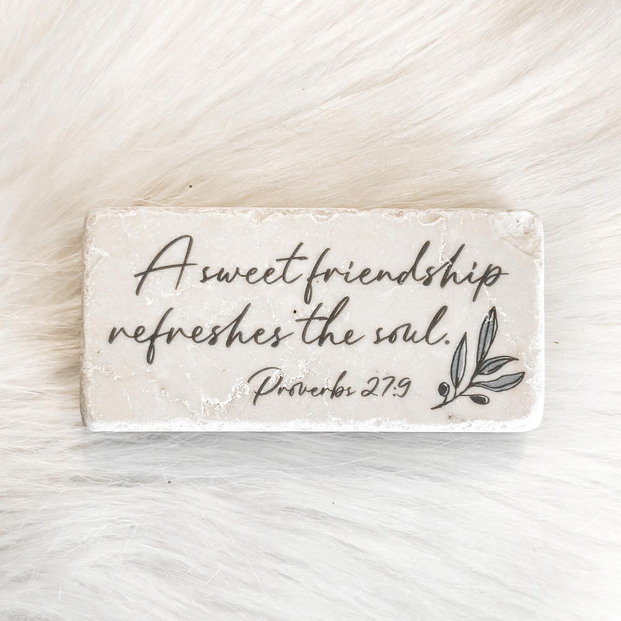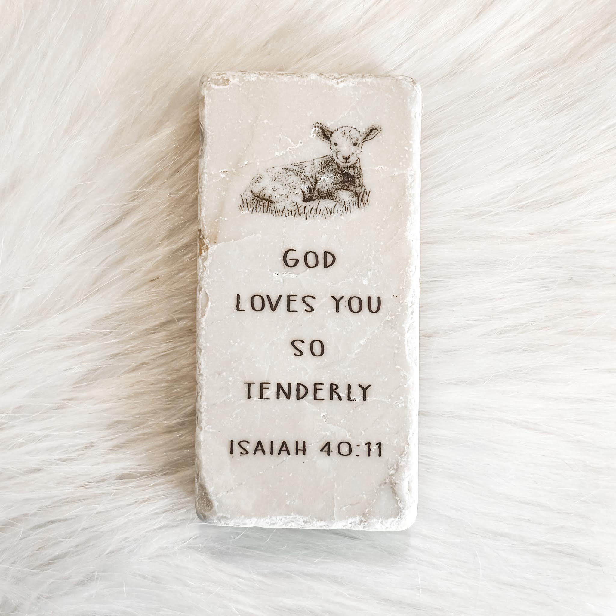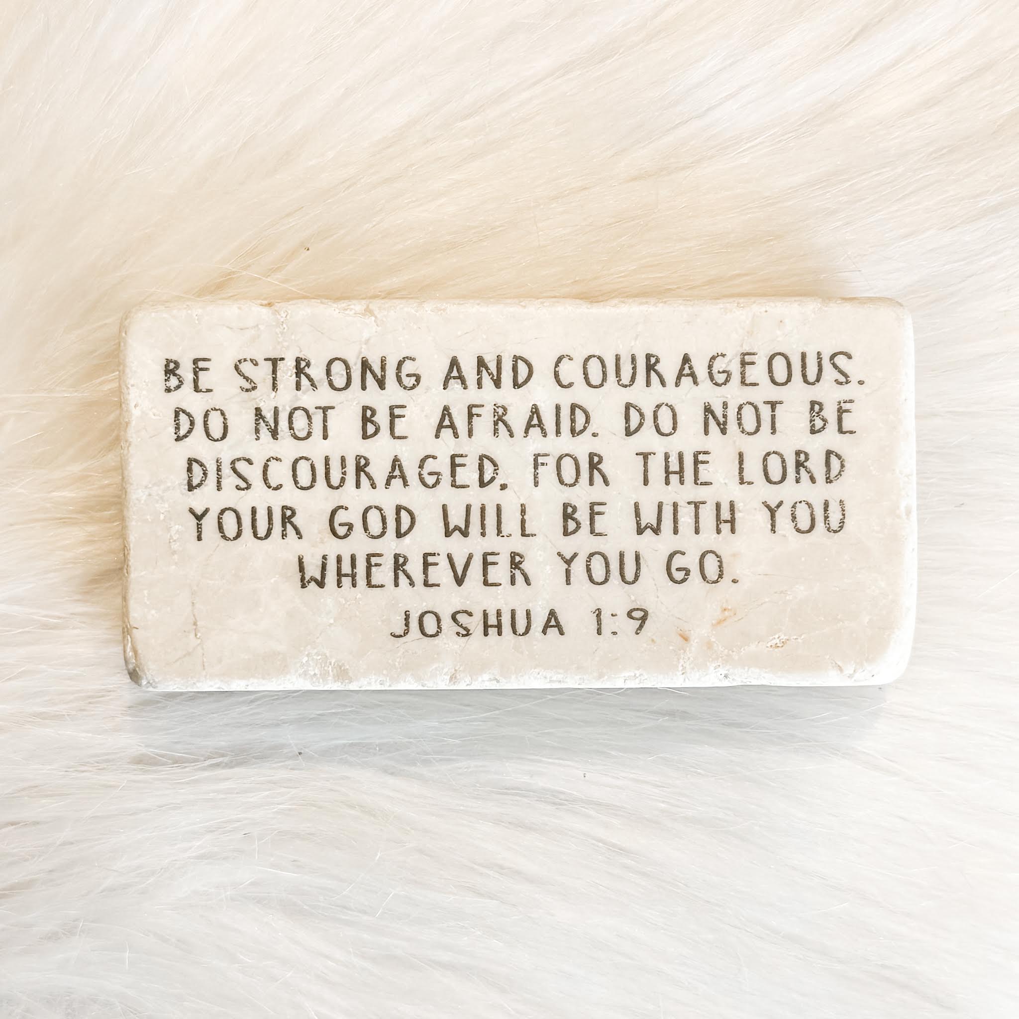 This Scripture Stone is hand-printed and distressed by artisans here in the United States. This unique marble is quarried in the mountains east of the ancient city of Ephesus
