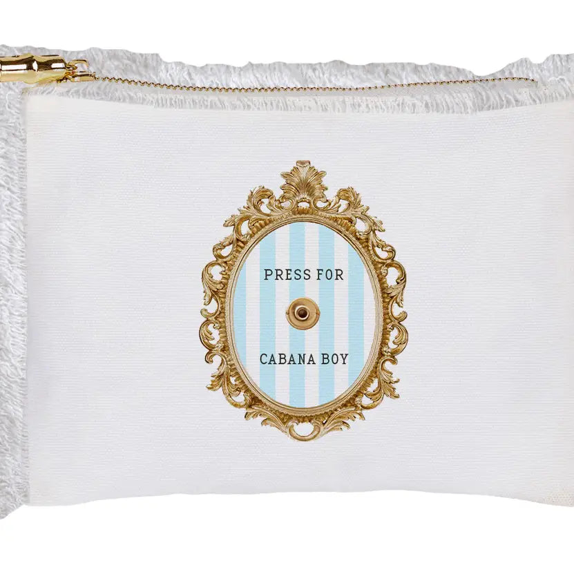 Details: The "Press for Cabana Boy" Flat Zip Pouch measures 8.5" x 6.5" and is a white linen fringe cosmetic bag. Gold zipper and zipper pull. Compact and portable, allowing to easily fit into your handbag, suitcase, or gym bag.